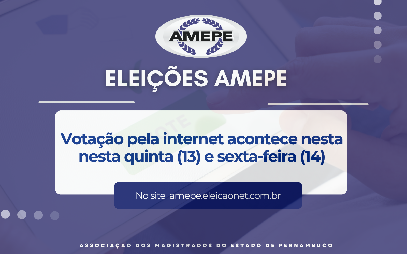 Participe das Eleições da AMEPE! A votação pela internet acontece das 8h desta quinta-feira (13) até às sexta-feira (14), no site amepe.eleicaonet.com.br